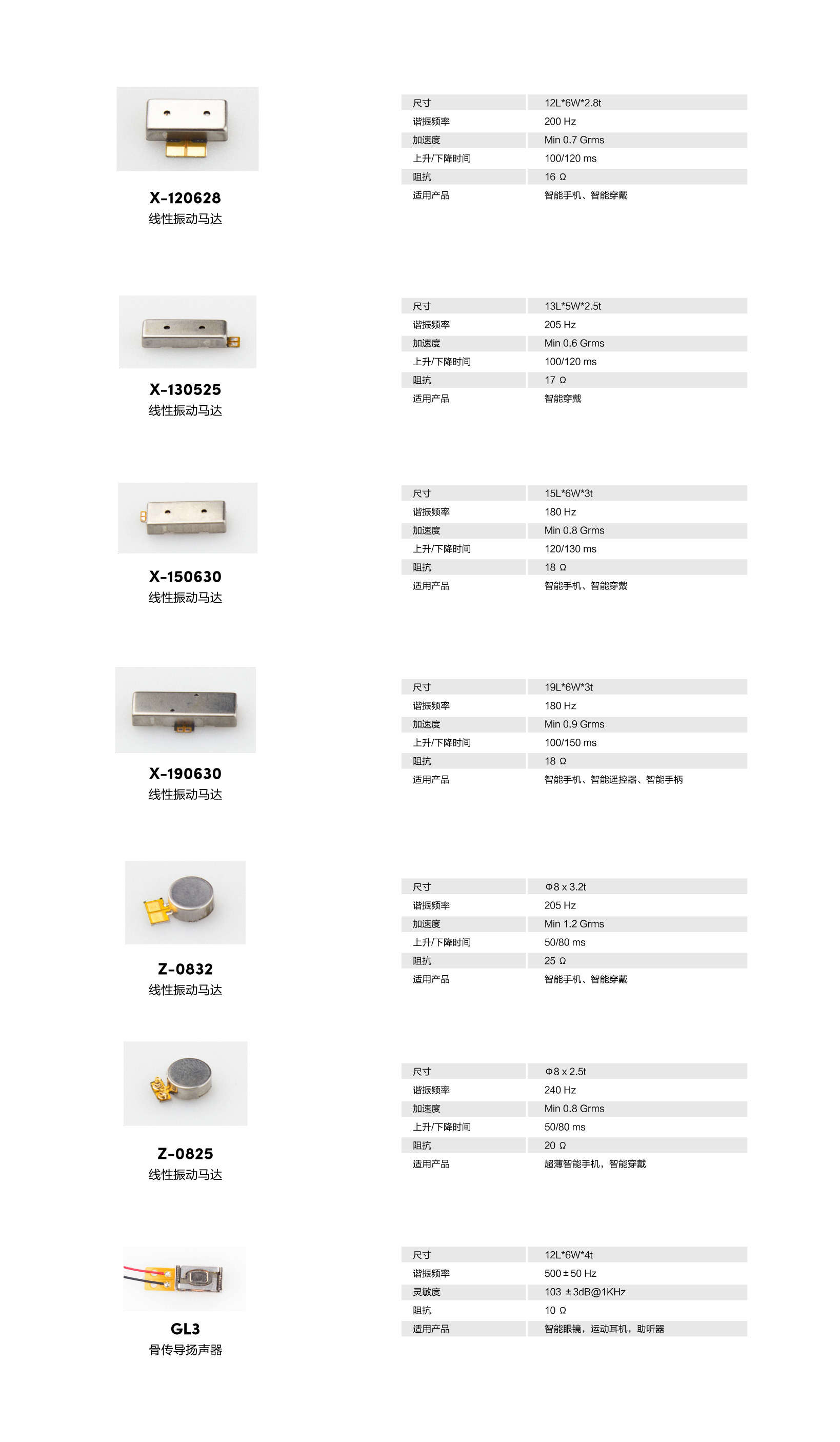 歌尔独立自主开发的线性振动马达,包括z向与x向线性马达,同比其他产品具有尺寸灵活,振感强度优秀,响应速度快,谐振频率低等特点。