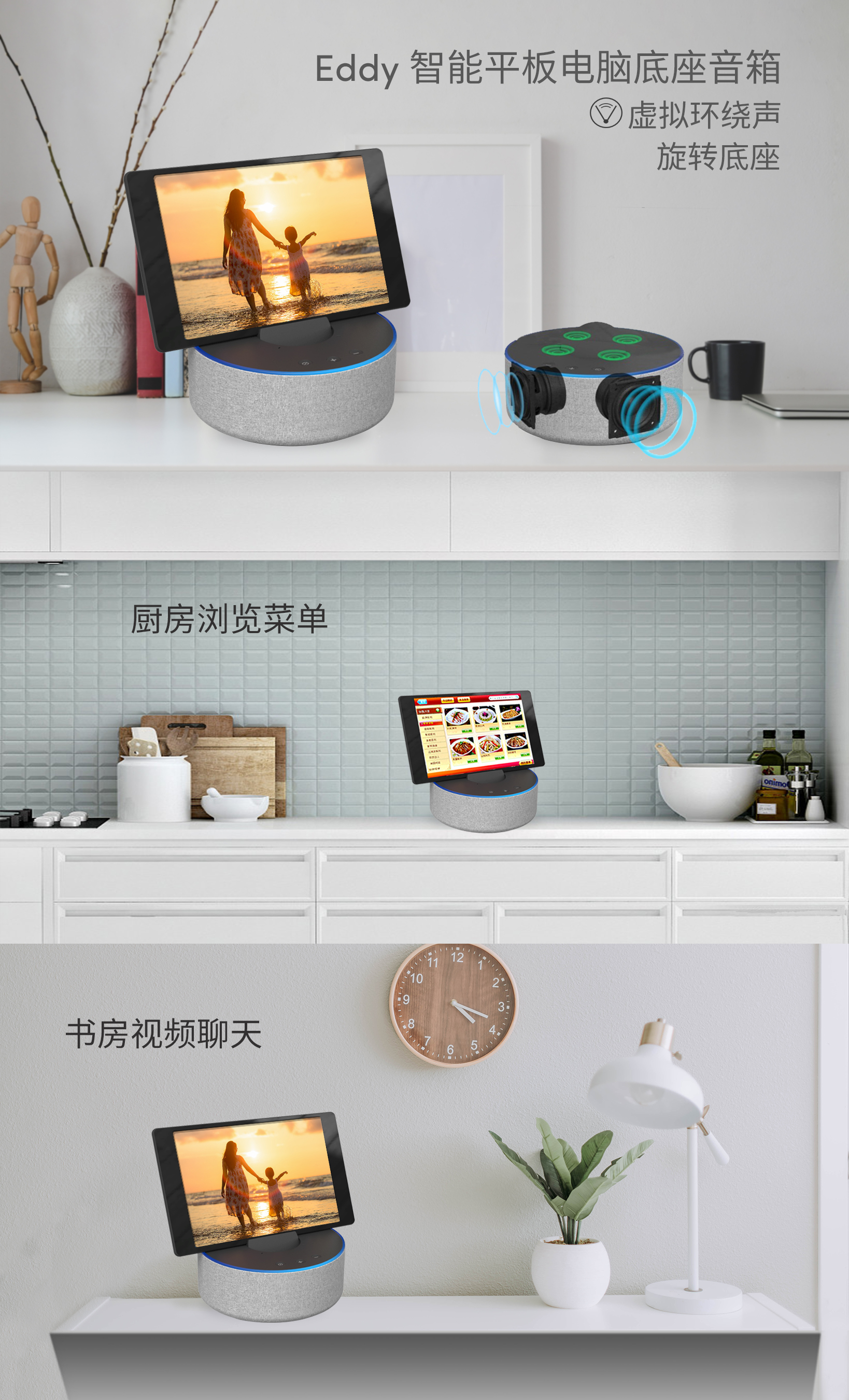 一款平板音箱底座,可赋予平板远场拾音的能力,其支持虚拟环绕声stage,并可通过声源定位实现自动旋转功能,让平板始终面对用户的方向。
