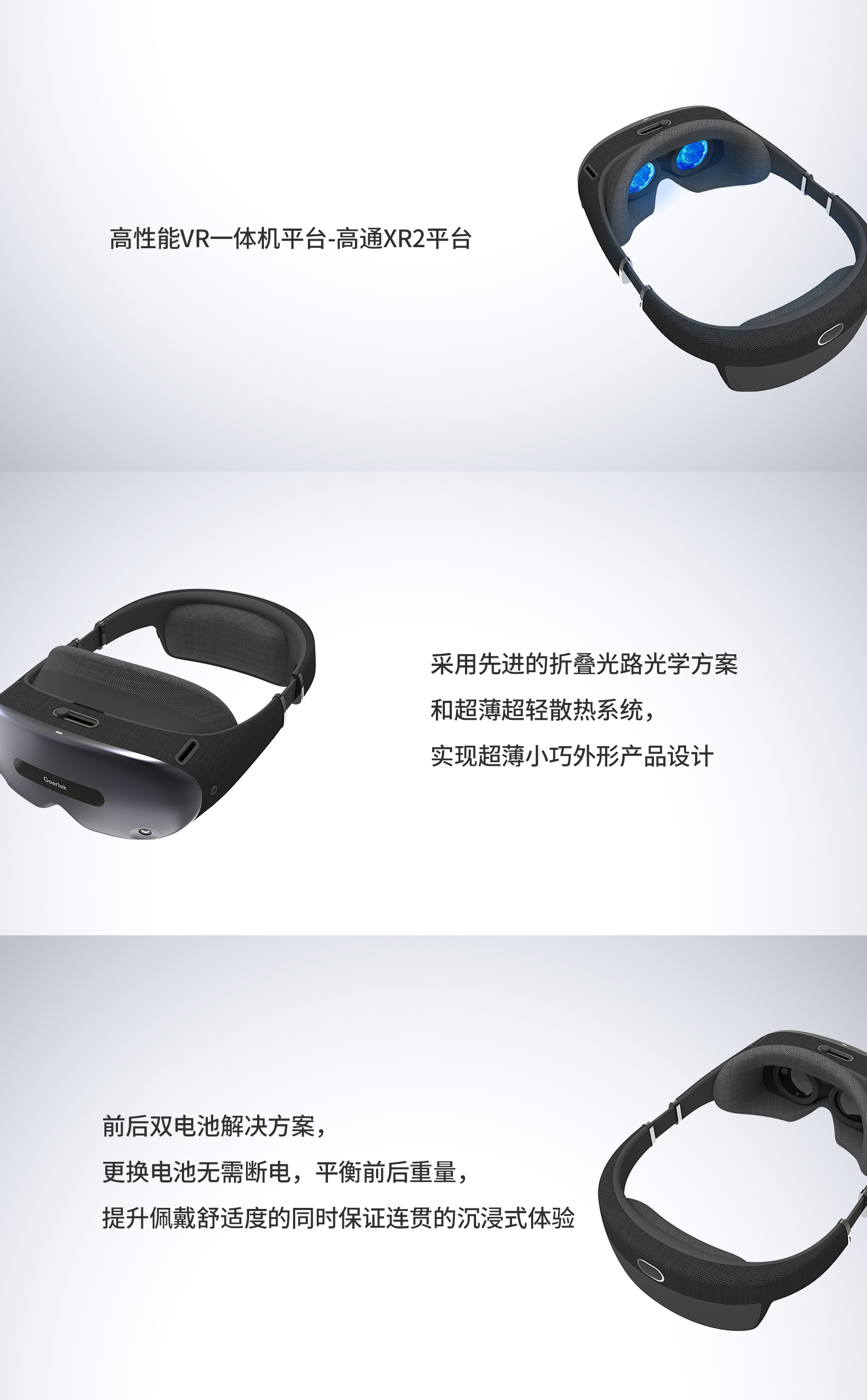 基于高通骁龙xr2平台的vr一体机参考设计,采用折叠光路光学方案实现超薄小巧外形产品设计,为消费者和企业用户提供沉浸式体验。
