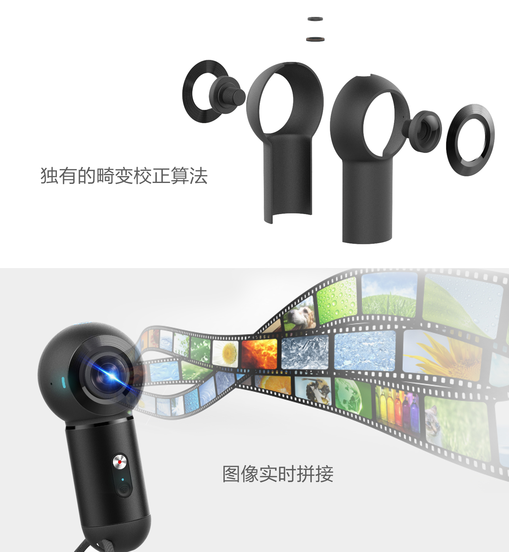 采用2颗超大广角镜头,每个镜头都有200 °的fov,可拍摄360°的全景图像,并能够连接wifi后通过手机app实现远程控制。