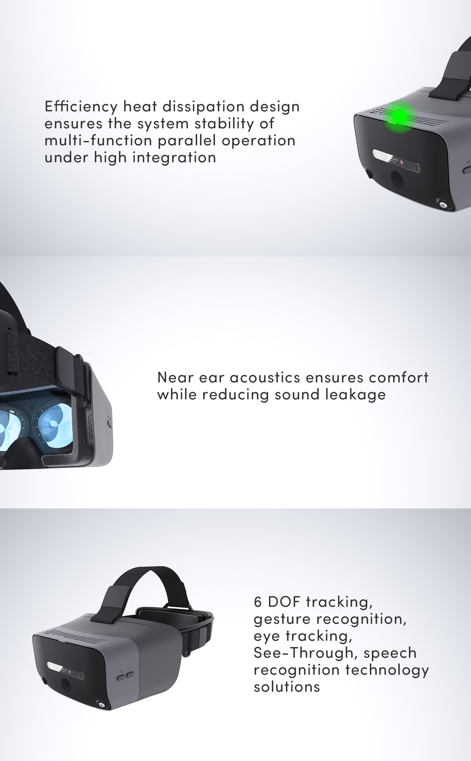 ■ the latest vr chip processing platform in the industry ■ the rear large capacity battery guarantees the endurance and even weight distribution ■ immersive experience with large field of view ■ near ear acoustics ensures comfort while reducing sound leakage ■ efficiency heat dissipation design ensures the system stability of multi-function parallel operation under high integration ■ 6 dof tracking, gesture recognition, eye tracking, see-through, speech recognition, am3d sound effect and other modular technology solutions