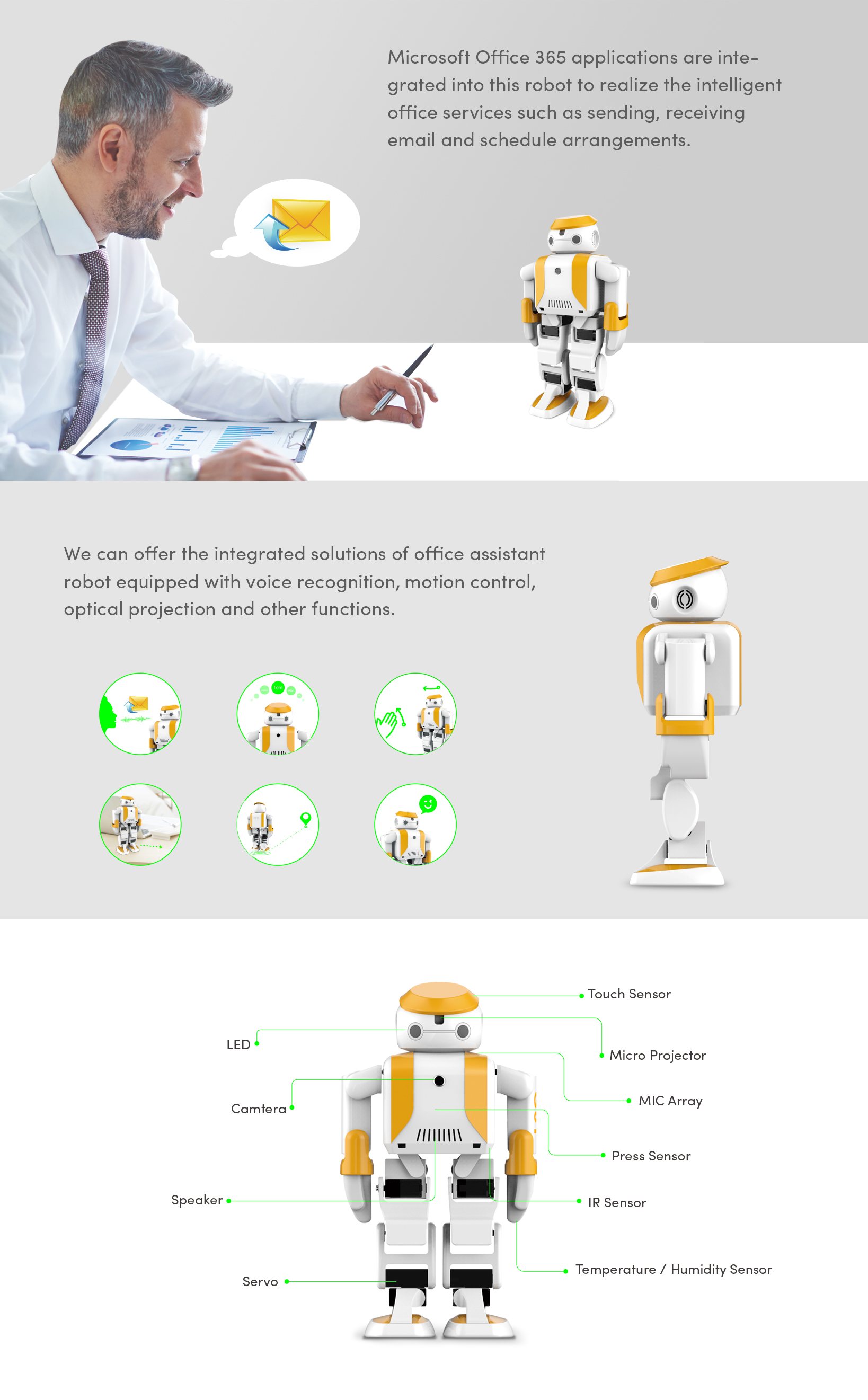 microsoft office 365 applications are integrated into this robot to realize the intelligent office services such as sending, receiving email and schedule arrangements. funchtions like voice recognition, motion control, optical projection and others make its using more convenient and intreresting.
