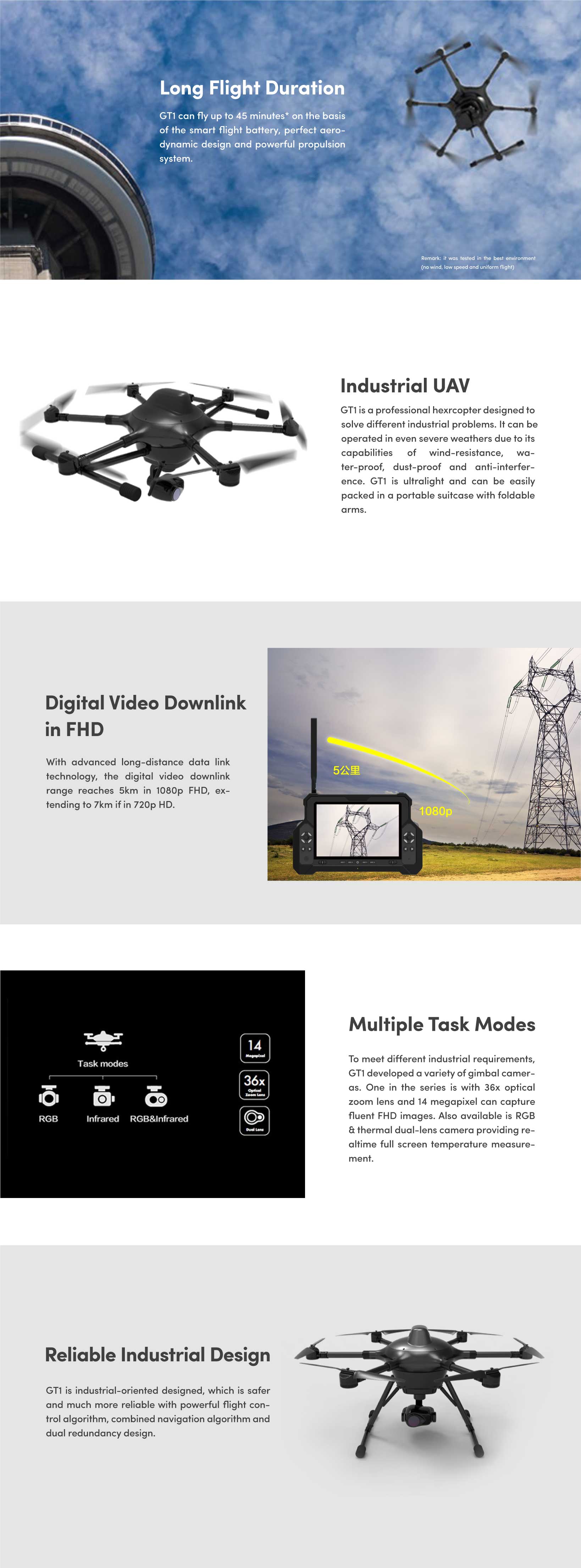 gt1 is a professional flight platform designed for solving industrial problems. featuring hd digital video downlink, multiple task modes, and long duration, the hexrcopter is widely welcomed by users from different industries, such as powerline inspection, police patrol, high way cruising and photovoltaic station monitoring.